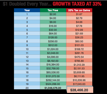 A dollar that doubles every year for 20 years grows to $1,048,576. What do you think the number will be if you take the same scenario and assume that gains are taxed each year at 33%? The ending balance is only $28,466!!!!