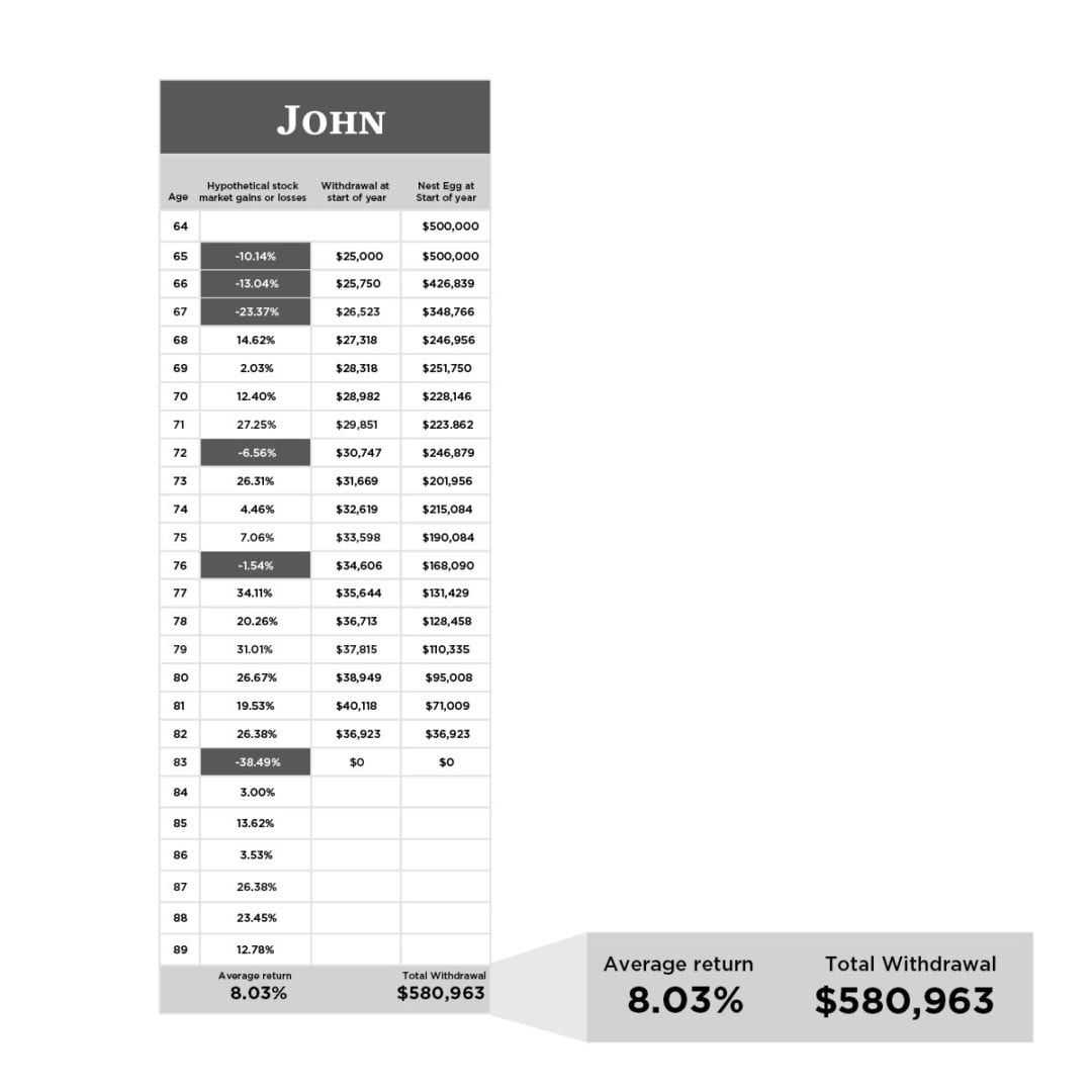 John is now 65 and has accumulated $500,000 (far more than the average American) and is ready to retire. Like most Americans nearing retirement, he is in a “balanced” portfolio (60% stocks, 40% bonds). Since interest rates are so low, John decides he will need to take out 5%, or $25,000, of his nest egg each year to make his income needs for his most basic standard of living. When added to his Social Security payments, he “should” be just fine. And he must also increase his withdrawal each year (by 3%) to adjust for inflation because each year the same amount of money will buy fewer goods and services.