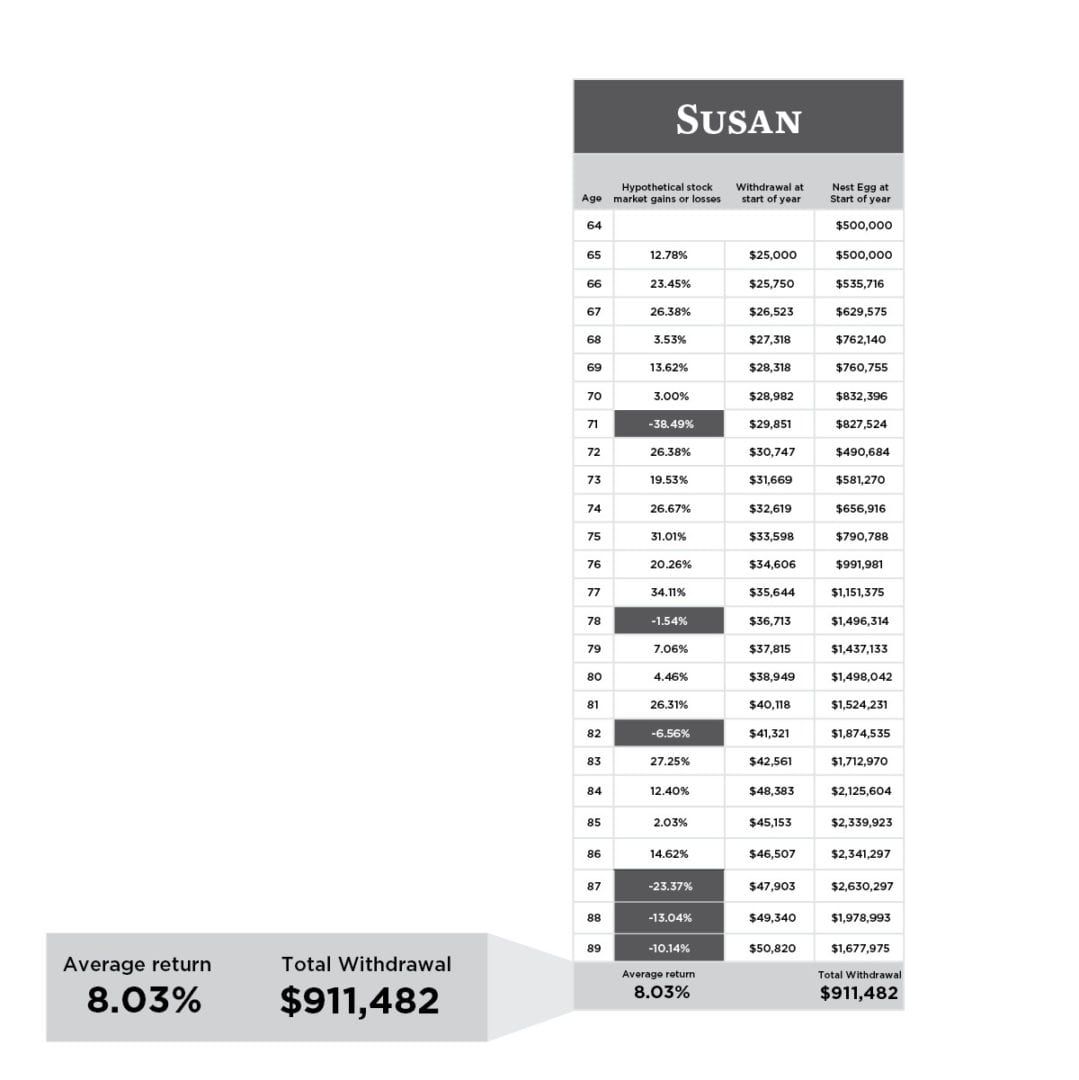 The risk we all face is the devastating concept of sequence of returns. Sounds complicated, but it’s not. In essence, the earliest years of your retirement will define your later years. If you suffer investment losses in your early years of retirement, which is entirely a matter of luck, your odds of making it the distance have fallen off the cliff.